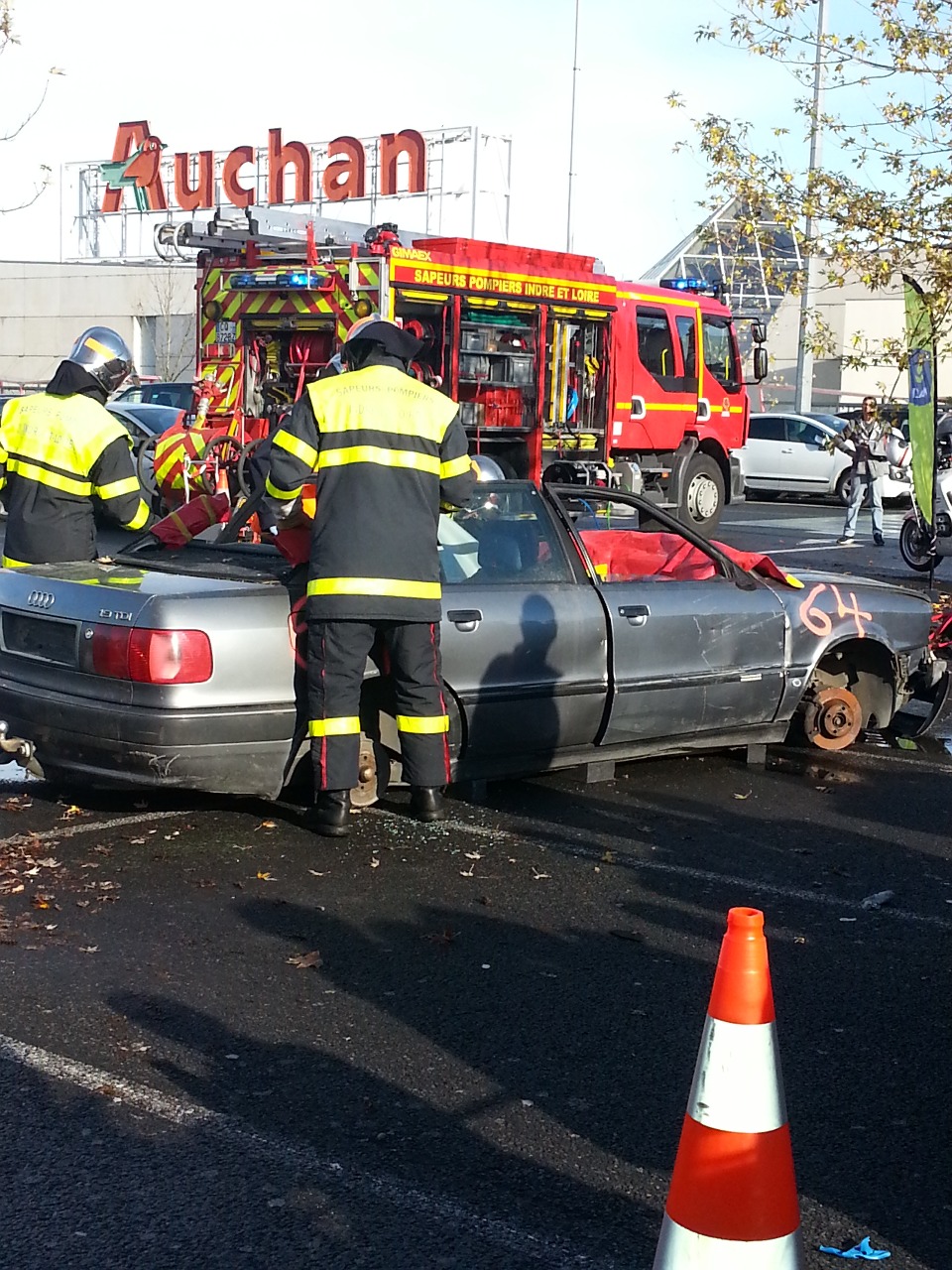 Simulation d'une manœuvre de désincarcération effectuée par les sapeurs-pompiers de Tours Nord
